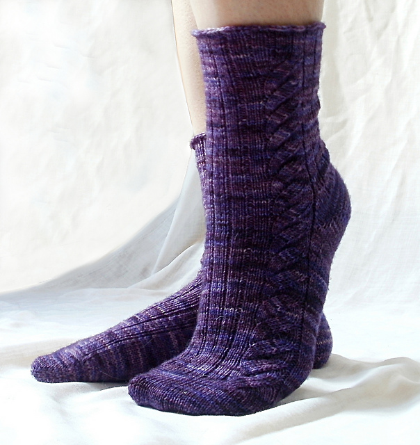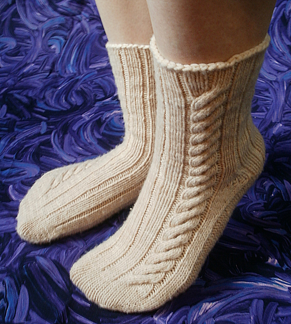 I was sketching on quite a few design ideas at that time, but none were ripe enough to submit. So I was thinking... what could I do with worsted? As usual, I looked through my old faves on ravelry, saw this, and the idea was sparked. Why not make some warm cushy cabled socks?