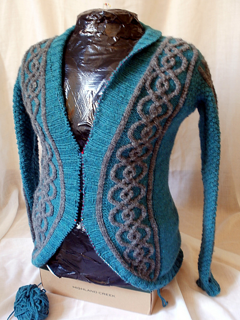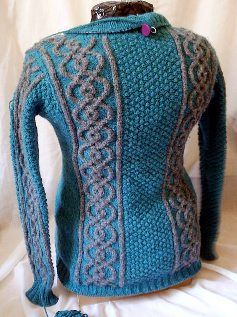 I'm finally rid of all those dangling bobbins! Whoot! I can't believe how fast I'm suddenly progressing on this without intarsia'ing the cables! There's only a little more than an inch missing now, but I've go to take it to my friend to see where she wants to have the buttonholes, so this is in time out again.